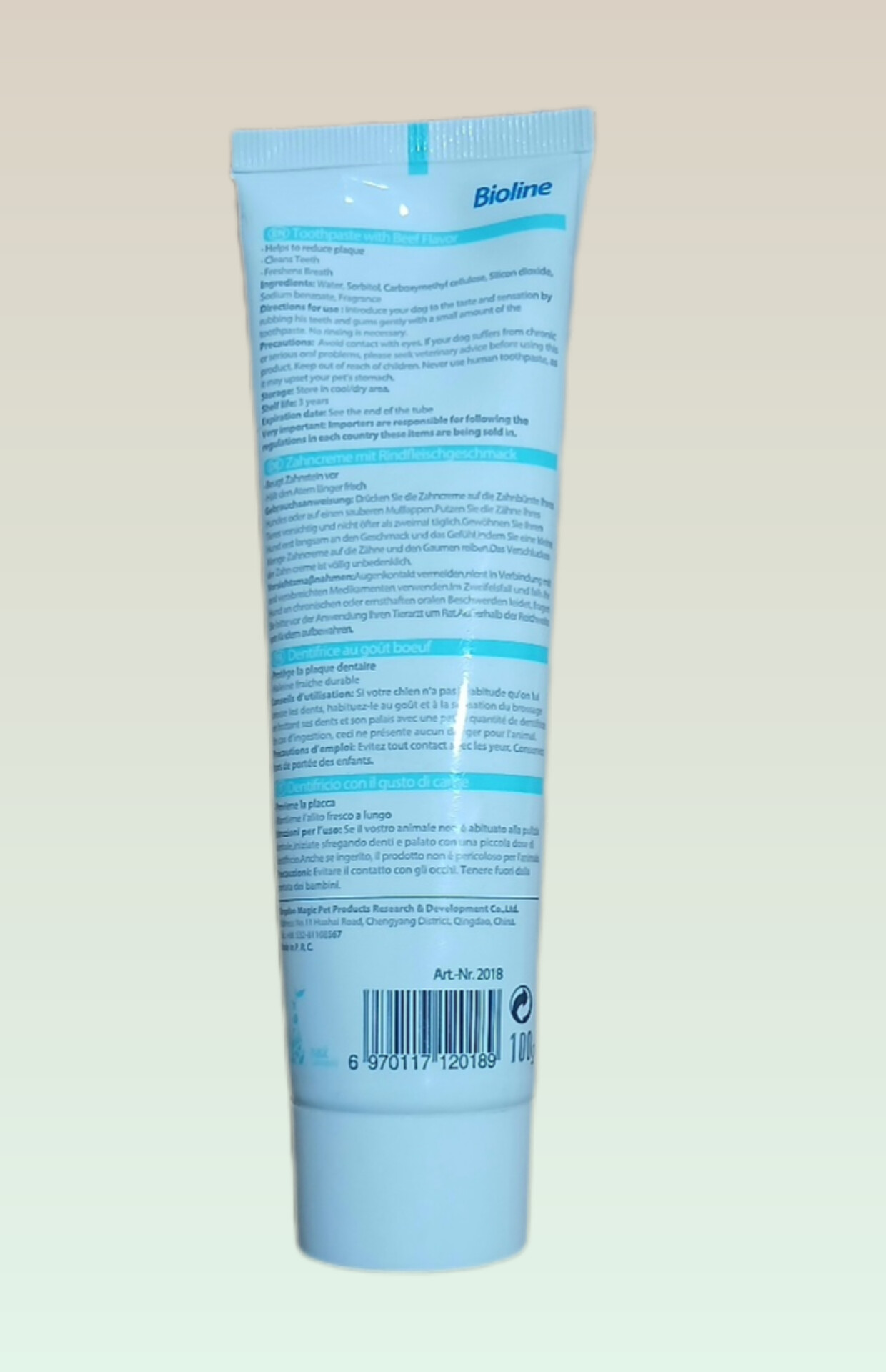 خمیر دندان سگ با طعم گوشت محصول بیولاین آلمان می باشد. در این خمیر دندان کاملاً از مواد طبیعی استفاده شده که برای رفع زردی و لکه های سیاه بر روی دندانهای سگ استفاده می شود. کمک به از بین رفتن بوی بد دهان می کند، فلورهای مضر را از بین می برد. باعث خوشبو و مطبوع شدن بوی دهان سگ می شود.